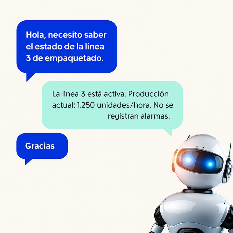 Un agente conversacional especializado en mantenimiento industrial que brinda respuestas técnicas inmediatas a los operarios, eliminando la necesidad de buscar en manuales o esperar a un supervisor. Entrenado con la documentación técnica específica de tu planta, se convierte en tu asistente digital 24/7.